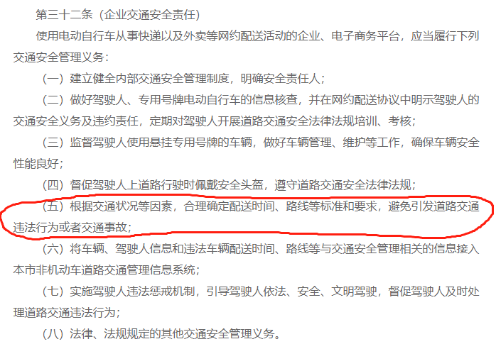 其次,条例从交通安全责任、消防安全责任、行业自律管理、处罚方法等方面,对从事外卖派送的企业和平台作出了明确的规定,包括合理确定配送时间、路线等标准和要求,避免引发道路交通违法行为或者交通事故、定期对驾驶人开展道路交通安全法律法规培训和考核、督促驾驶人规范停放电动自行车和进行安全充电等。