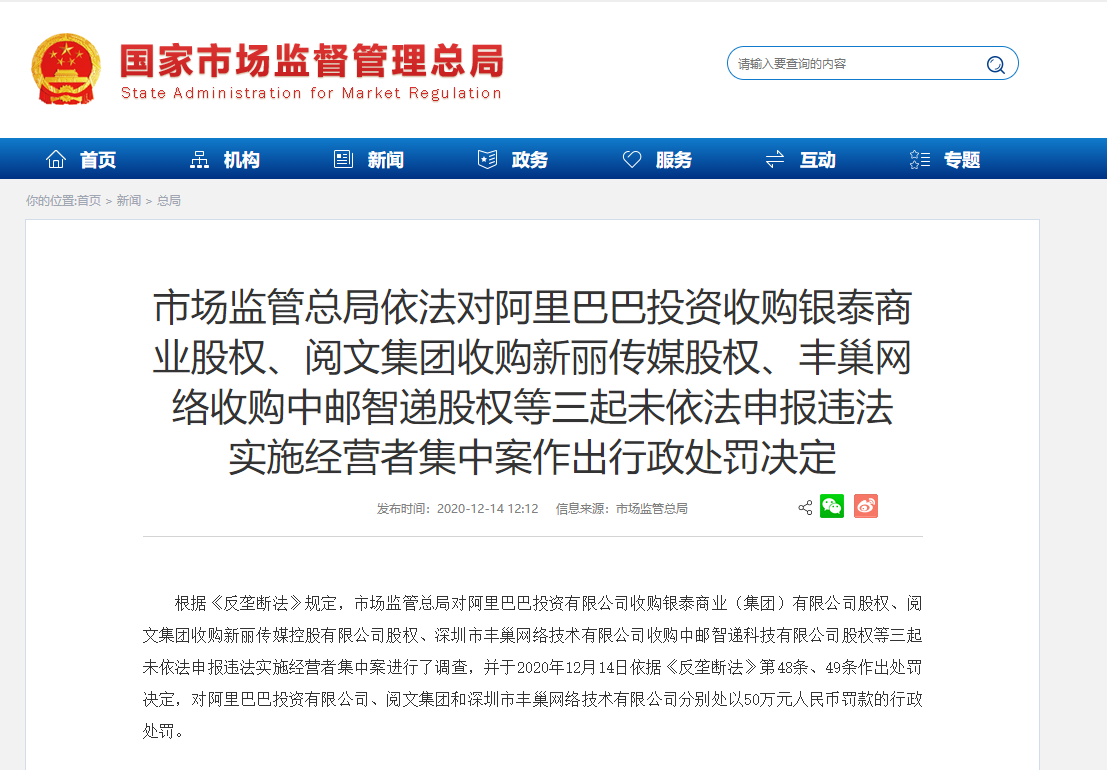 据国家市场监管总局官网,根据《反垄断法》规定,市场监管总局对阿里巴巴投资有限公司收购银泰商业(集团)有限公司股权、阅文集团收购新丽传媒控股有限公司股权、深圳市丰巢网络技术有限公司收购中邮智递科技有限公司股权等三起未依法申报违法实施经营者集中案进行了调查,并于2020年12月14日依据《反垄断法》第48条、49条作出处罚决定,对阿里巴巴投资有限公司、阅文集团和深圳市丰巢网络技术有限公司分别处以50万元人民币罚款的行政处罚。