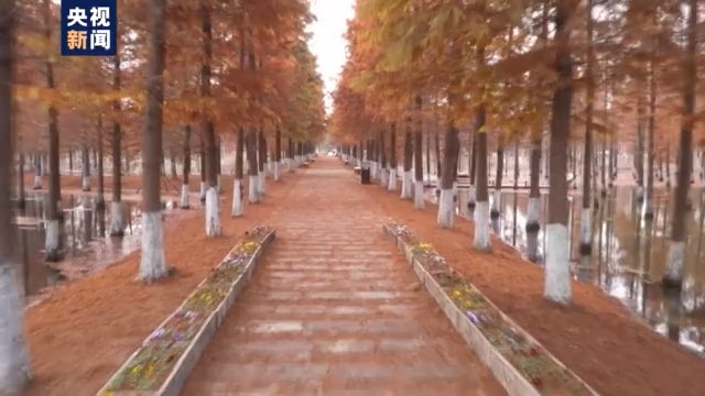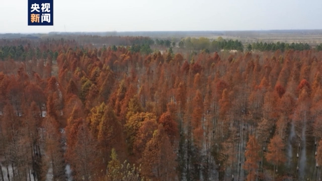 随着气温越来越低,江苏泗洪县的洪泽湖湿地,一万多株水杉、池杉、落羽杉披上了彩妆,从空中看去,红绿相间的森林美不胜收,游客徜徉其中,宛如进入了一个红色的童话世界,如梦如幻,让人流连忘返。