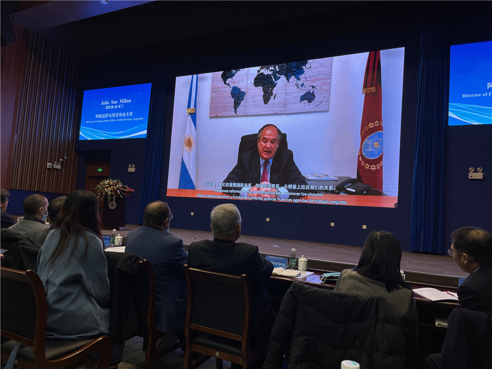 阿根廷萨尔塔省外办主任胡里奥·圣·米兰在“后疫情时期的中拉人文交流”国际研讨会上发表视频致辞。新华社记者 张源培 摄