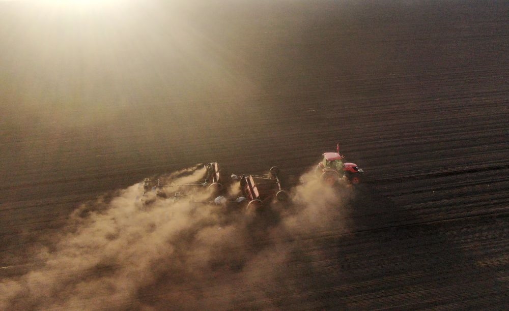 ↑5月15日,在位于祁连山脚下的青海省海北藏族自治州门源回族自治县,工人驾驶农机在油菜田里播种(无人机照片)。新华社记者 张宏祥 摄