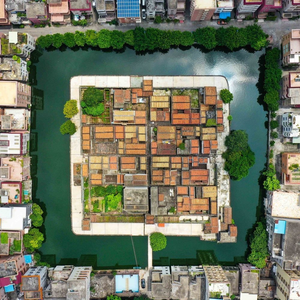 逆水流龟村堡位于广东东莞虎门镇白沙社区,为明末清初年间虎门白沙人郑瑜所建,距今已有370多年历史。占地面积6889平方米的村堡四周环水,护村河宽18米,是典型的军事防御村堡。该村堡因形制似龟,逆水而上,故称逆水流龟,从空中俯瞰仿佛是乐高积木搭建而成。新华社记者 刘大伟 摄