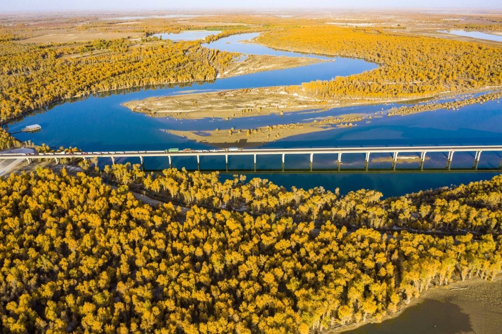 ↑这是新疆塔里木河畔的阿克苏地区沙雅县月亮湾景区内的胡杨林(10月22日摄,无人机照片)。