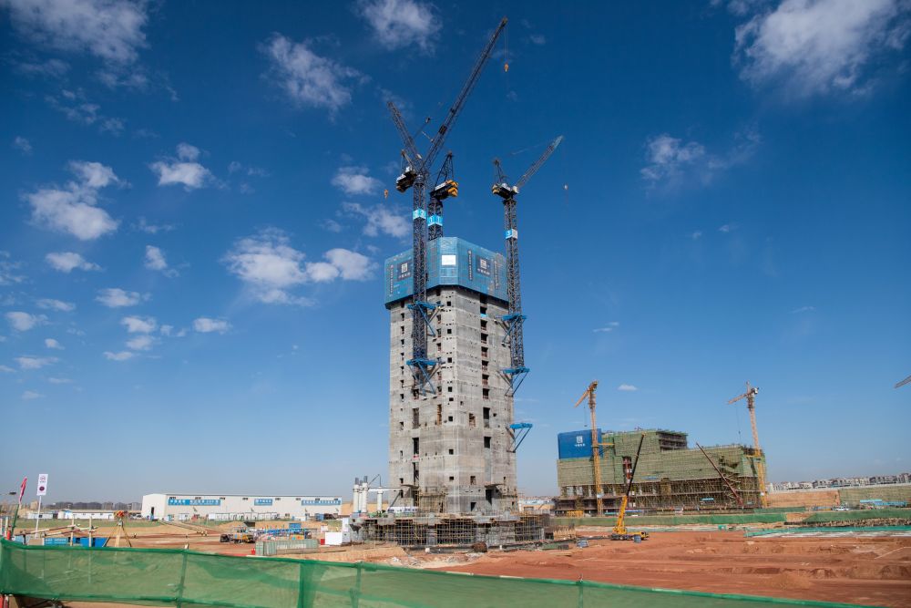 2019年12月10日在埃及新行政首都中央商务区项目工地拍摄的建设中的标志塔。(新华社记者邬惠我摄)