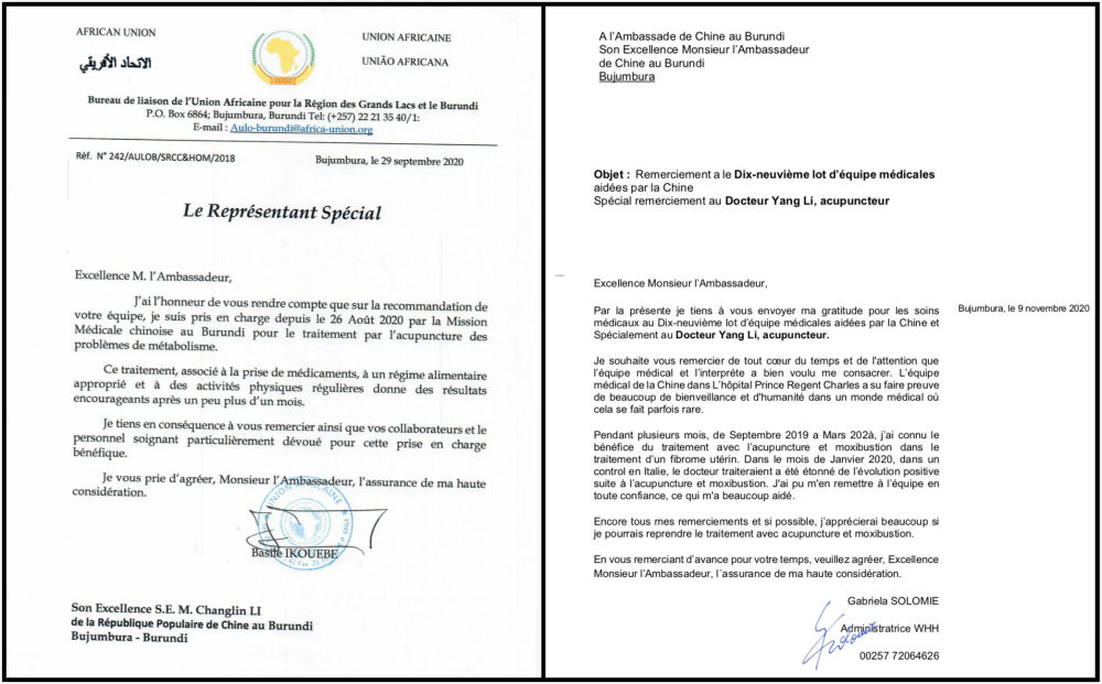 不久前,非洲联盟驻布隆迪大使巴西勒·伊奎贝和世界粮食计划署官员加布丽埃拉·索洛米在接受针灸治疗后,先后向中国驻布隆迪大使馆寄感谢信,专门向杨利致谢。