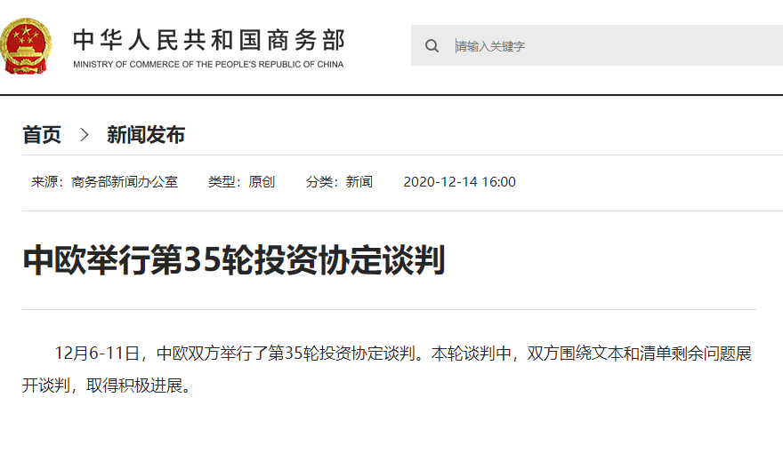 12月6—11日,中欧双方举行了第35轮投资协定谈判。本轮谈判中,双方围绕文本和清单剩余问题展开谈判,取得积极进展。(总台央视记者 刘颖 张道峰 戈晓威)