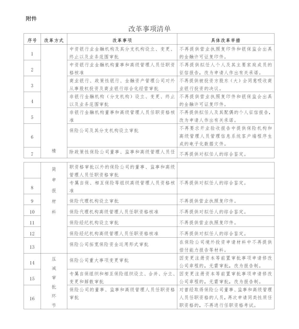 通知涉及精简申报材料、压减审批环节两类改革方式,对“证照分离”改革的落实和管理提出要求,明确中资银行业金融机构及其分支机构设立、变更、终止以及业务范围审批不需再提供营业执照复印件和银保监会出具的金融许可证复印件、保险公司重大事项变更审批中因变更注册资本等前置审批事项申请修改公司章程由审批改为报告等16项具体改革措施。