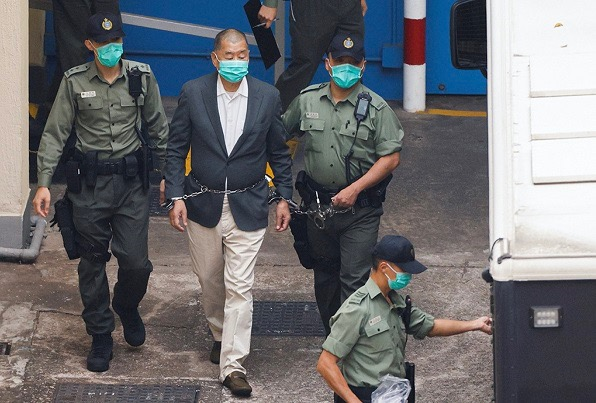 △12月12日,黎智英离开收押所,被囚车押解到西九龙法院提讯。