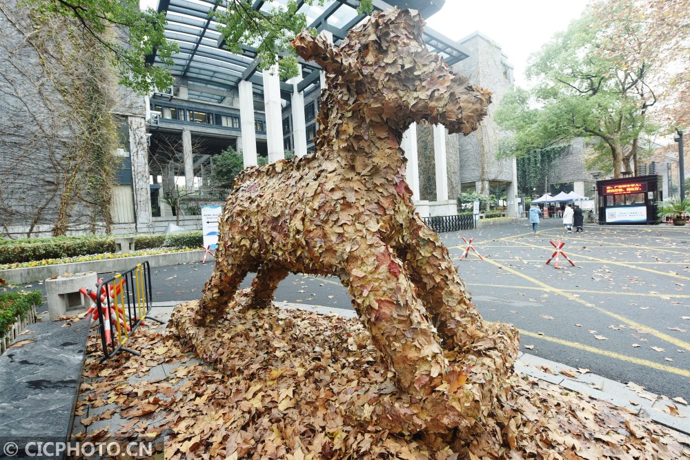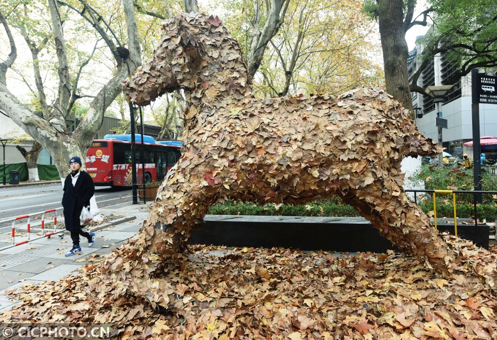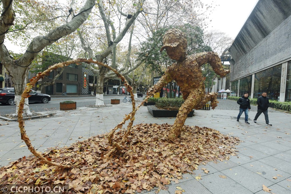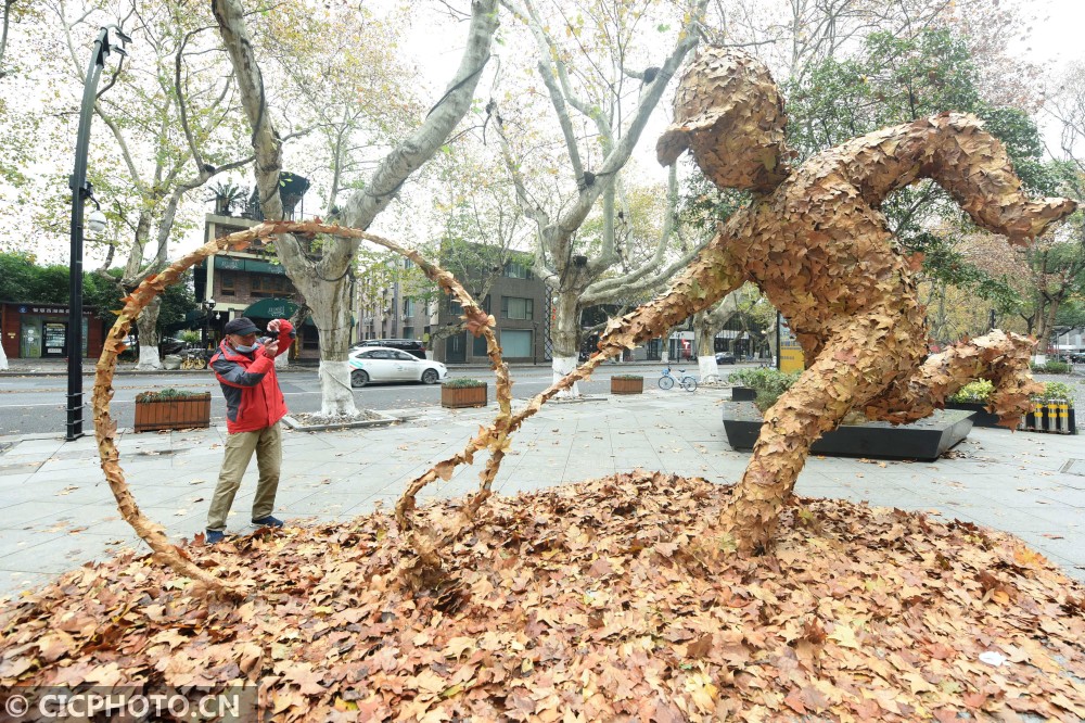 ↑2020年12月14日在浙江杭州街头拍摄的落叶艺术作品。CICPHOTO/龙巍 摄