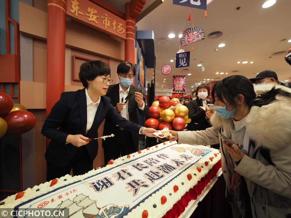 ↑2020年12月11日晚,北京东安市场内,工作人员将写着“谢君长陪伴,共赴潮未来”字样的蛋糕分发给顾客。CICPHOTO/杜建坡 摄