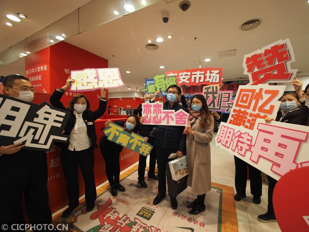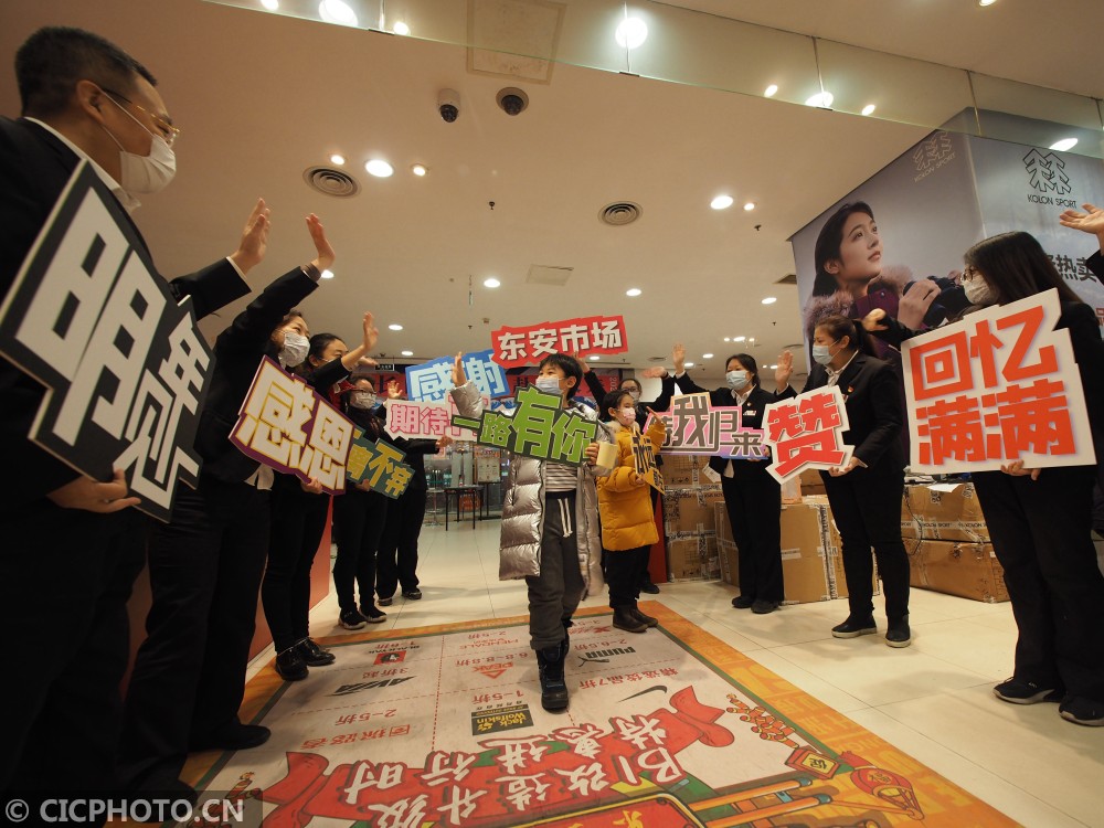 ↑2020年12月11日晚,北京东安市场内,工作人员列队欢送顾客。CICPHOTO/杜建坡 摄