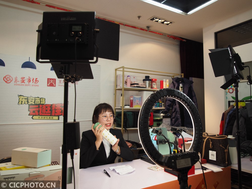 ↑2020年12月11日晚,北京东安市场内,工作人员通过直播方式进行销售。闭店改造期间,东安市场的线上销售将会持续。CICPHOTO/杜建坡 摄