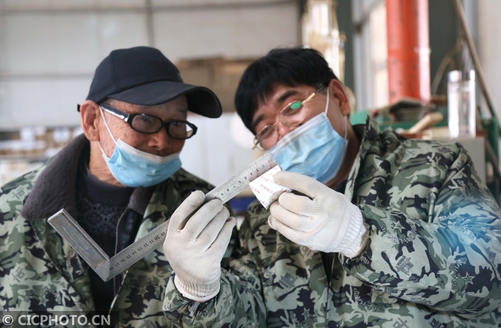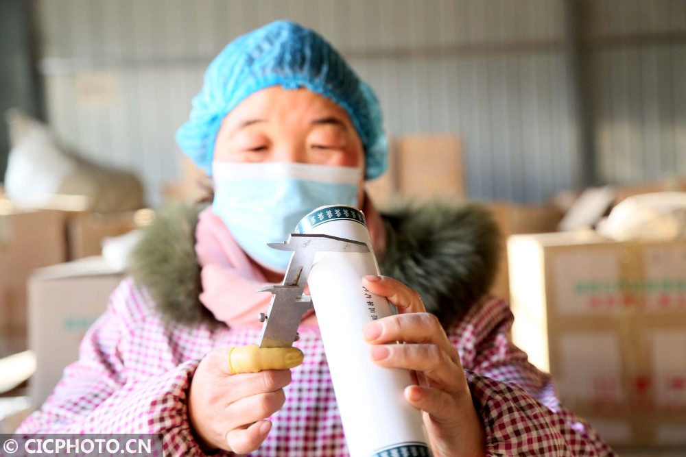 ↑2020年12月10日,在河南省汝阳县陶营镇一家艾制品有限公司成品库,质检员对产品质量抽样质检。CICPHOTO/康红军 摄