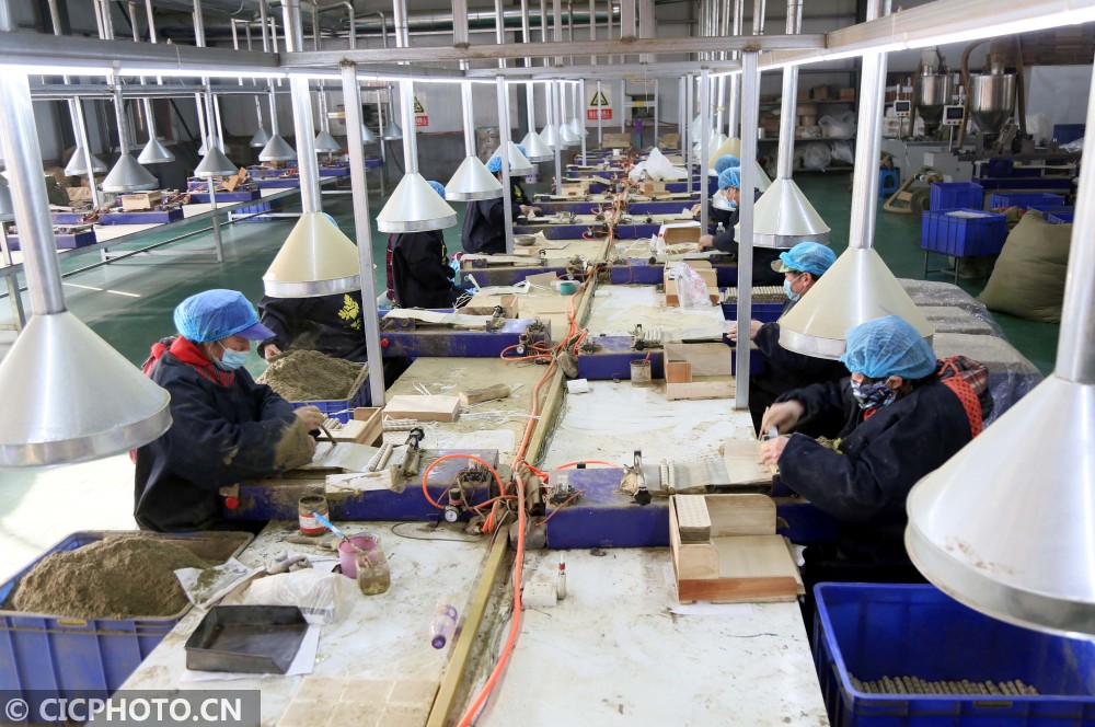 ↑2020年12月10日,在河南省汝阳县陶营镇一家艾制品有限公司生产车间,工人在生产艾制品。CICPHOTO/康红军 摄