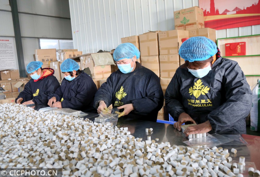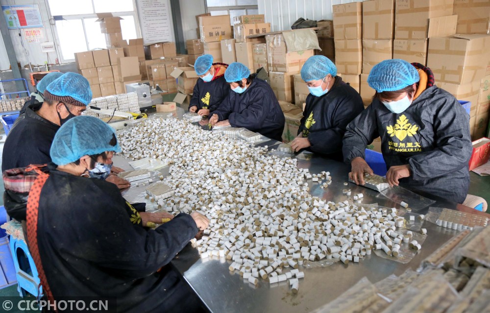 ↑2020年12月10日,在河南省汝阳县陶营镇一家艾制品有限公司包装车间,工人在包装艾柱产品。CICPHOTO/康红军 摄