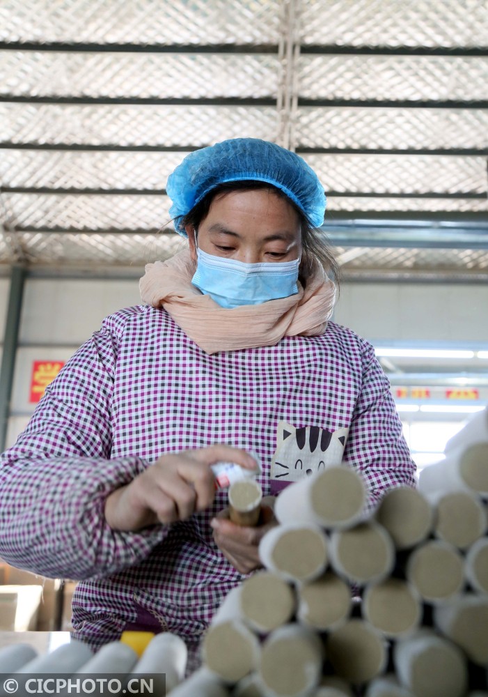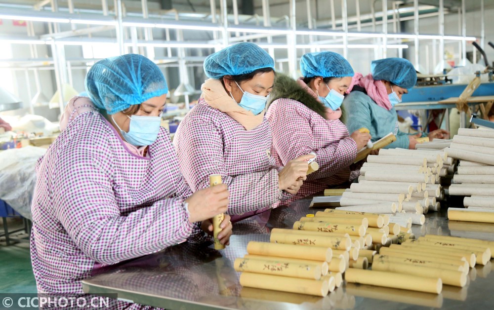 ↑2020年12月10日,在河南省汝阳县陶营镇一家艾制品有限公司生产车间,工人在给艾条贴商标。CICPHOTO/康红军 摄