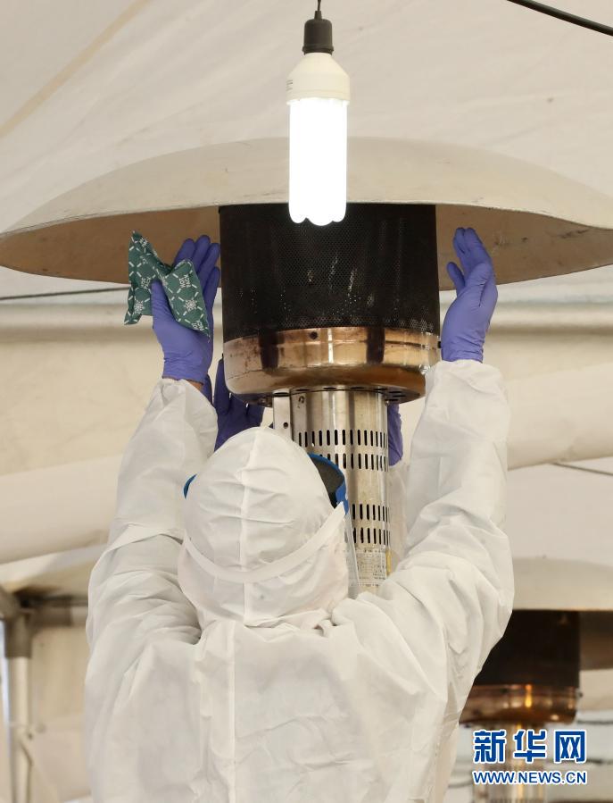 12月14日,一名工作人员在韩国首尔龙山区一处临时筛查所工作间隙靠近暖炉取暖。