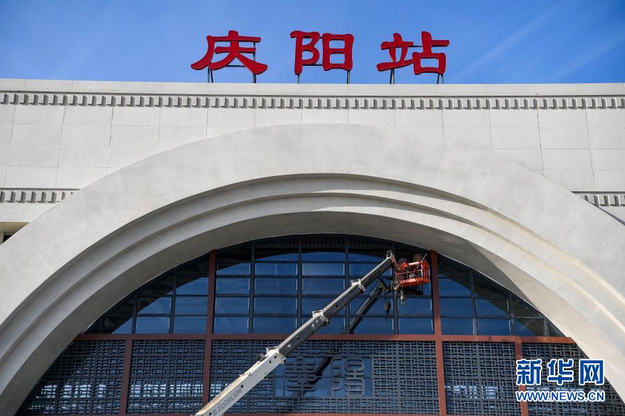 12月14日,保洁人员在银西高铁庆阳站进行清洁作业。