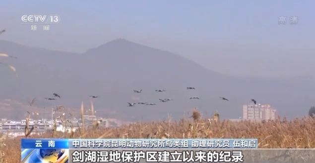 中国科学院昆明动物研究所鸟类组 助理研究员 伍和启:目前,我们监测到灰鹤最大的种群数量有33只,这个(种群数量)是已经突破了剑湖湿地保护区建立以来的纪录,早上我们又在后面的这一块农田当中,记录到18只灰鹤在这个地方取食活动。