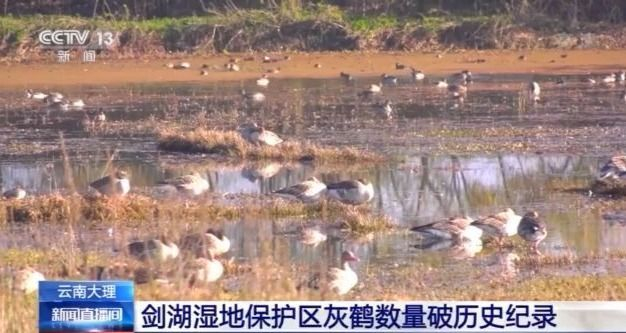 云南大理的剑川剑湖湿地位于我国西部候鸟迁徙的主要通道上,这里既是候鸟迁徙的集结点和停歇地,也是云贵高原上水鸟越冬的重要栖息地。随着冬季的到来,剑湖湿地迎来了近3万只越冬候鸟,经科研人员监测,国家二级重点保护鸟类灰鹤种群数量达到33只,创保护区建立以来最高纪录。