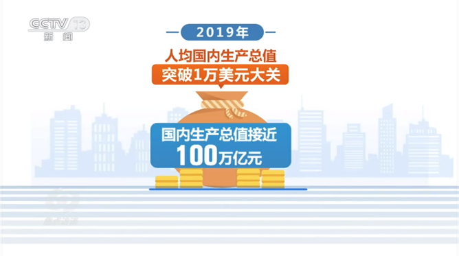 全面建成小康社会离不开雄厚的物质基础。改革开放以来,我国经济实力大幅跃升。2019年,国内生产总值接近100万亿元,人均国内生产总值也从改革开放初期的几百美元突破1万美元大关。