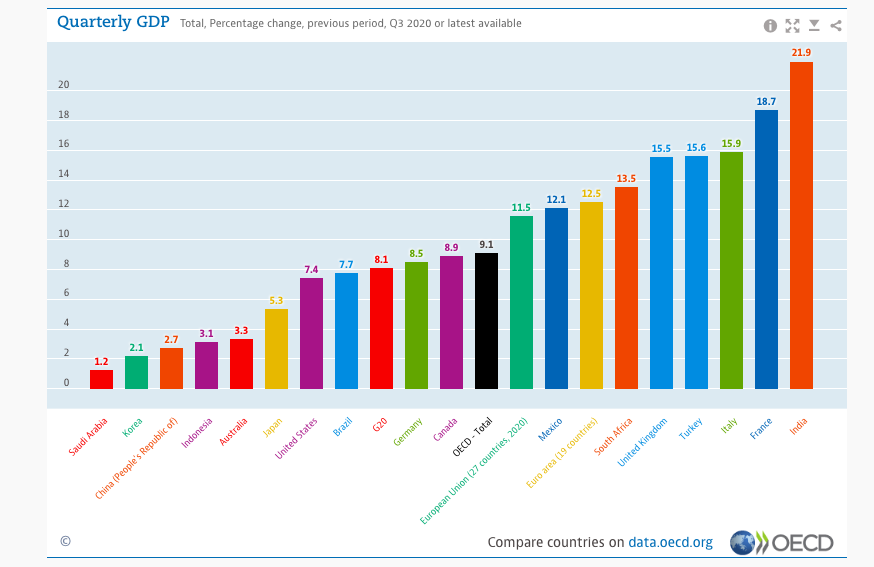 经合组织的数据显示,二十国集团各经济体第三季度都实现了增长。其中,印度经济在经历了第二季度25.2%的历史最大跌幅后,第三季度回升21.9%,反弹幅度最大。法国、意大利、土耳其、英国、南非、欧元区和墨西哥也都在经历了第二季度两位数的下跌后,在第三季度实现两位数增长。美国第三季度经济环比增长7.4%。中国是唯一一个实现第二季度和第三季度经济连续增长的二十国成员。