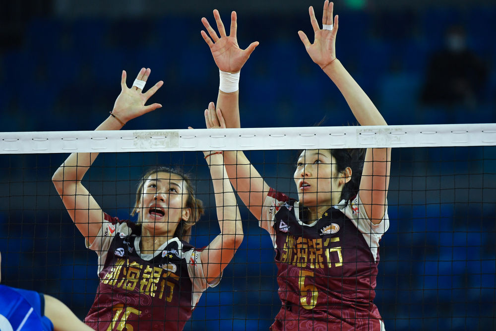 12月6日,天津渤海银行队球员朱婷(右)、王媛媛在比赛中拦网。当日,在广东江门举行的2020-2021赛季中国女子排球超级联赛第三阶段C组比赛中,天津渤海银行队以3比0战胜辽宁华君队。新华社记者刘大伟摄