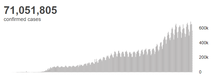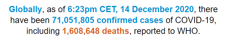 根据世卫组织最新实时统计数据,截至欧洲中部时间12月14日18时23分(北京时间12月15日1时23分),全球累计新冠肺炎确诊病例71051805例,累计死亡病例1608648例。14日全球新冠肺炎确诊病例新增574969例,死亡病例新增8726例。(总台记者 朱赫)