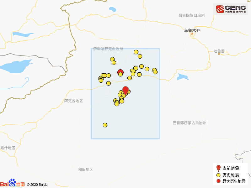历史地震:根据中国地震台网速报目录,震中周边200公里内近5年来发生3级以上地震共162次,最大地震是2017年9月16日在新疆阿克苏地区库车县发生的5.7级地震(距离本次震中102公里),按震级大小前50次历史地震分布如图。