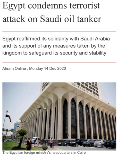 声明强调,埃及“强烈反对”针对该地区水域和沙特重要设施的任何恐怖袭击行为,并称该袭击是“对海湾国家的稳定与安全以及航行自由与国际贸易的威胁”。