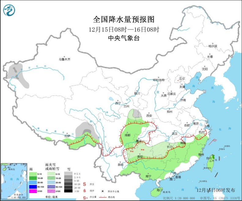 降水方面,受南下冷空气与偏南暖湿气流共同影响,昨天,江南中部及西南地区东部等地雨雪明显,像是浙江中南部、江西北部、湖南东北部等地部分地区出现降雪、雨夹雪或雨转雪,降水量有3~15毫米;贵州西部和东南部、湖南中部等局地出现冻雨。