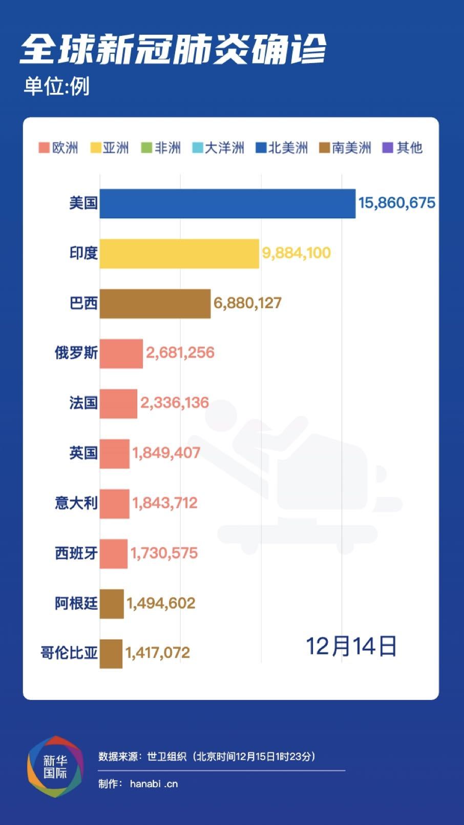 世界卫生组织:截至欧洲中部时间14日18时23分(北京时间15日1时23分),全球新冠确诊病例较前一日增加574969例,达到71051805例;死亡病例增加8726例,达到1608648例。