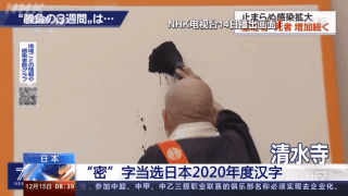 京都清水寺住持当天在寺里挥毫写下一个硕大的“密”字。主办方表示,选择“密”这个字的最主要原因,是随着新冠肺炎疫情扩大,出现了“三密”这个词,也就是指密闭环境、密集场所和密切接触,这对人们的日常生活产生了很大影响。