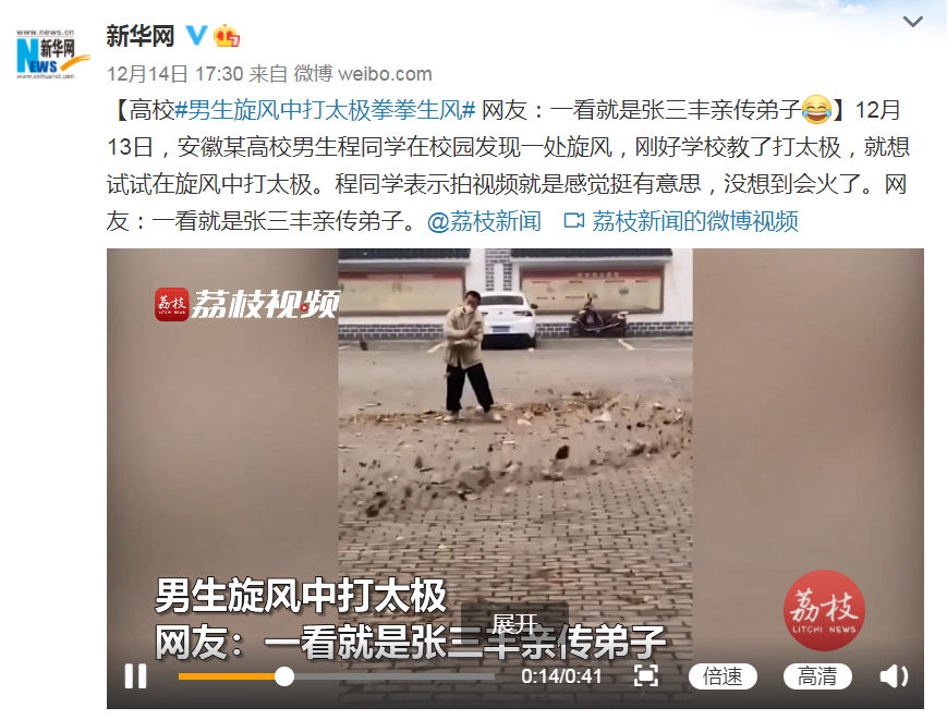 12月13日,安徽某高校男生程同学在校园发现一处旋风,刚好学校教了打太极,就想试试在旋风中打太极。程同学表示拍视频就是感觉挺有意思,没想到会火了。网友:一看就是张三丰亲传弟子。