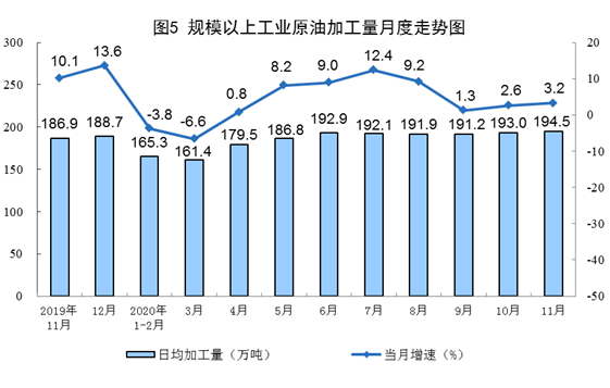 原油生产增速略有回落。11月份,生产原油1596万吨,同比增长1.2%,增速比上月回落0.2个百分点;日产53.2万吨,环比增加0.3万吨。加工原油5835万吨,增长3.2%,比上月加快0.6个百分点。1—11月份,生产原油1.8亿吨,同比增长1.6%;加工原油6.1亿吨,增长3.1%。