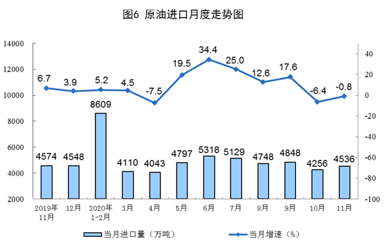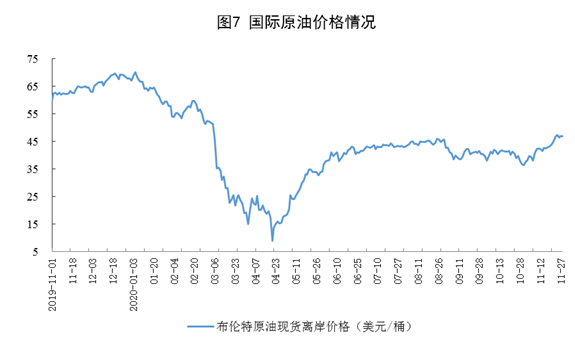 原油进口降幅收窄,国际原油价格上涨。进口原油4536万吨,环比增加280万吨,同比下降0.8%,降幅比上月收窄5.6个百分点;1—11月份,进口原油5.0亿吨,同比增长9.5%。11月30日,布伦特原油现货离岸价格为46.84美元/桶,比10月30日的36.33美元/桶上涨28.9%。