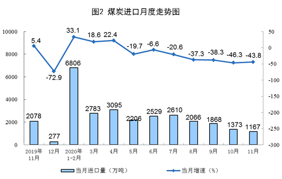 煤炭进口降幅有所收窄。11月份,进口煤炭1167万吨,环比减少206万吨,同比下降43.8%,降幅收窄2.5个百分点。1—11月份,进口煤炭2.6亿吨,同比下降10.8%。