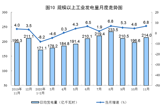 电力生产明显加快。11月份,发电量6419亿千瓦时,同比增长6.8%,增速比上月加快2.2个百分点;日均发电214.0亿千瓦时,环比增加17.4亿千瓦时。1—11月份,发电量66824亿千瓦时,同比增长2.0%。