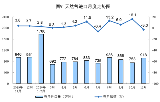 天然气进口由增转降。11月份,进口天然气918万吨,同比下降3.0%,上月为增长16.1%。1—11月份,进口天然气9044万吨,同比增长3.9%。