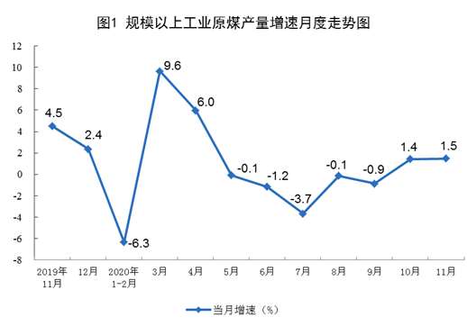 12月15日,国家统计局发布2020年11月份能源生产情况,11月份,我国规模以上工业原煤、原油、天然气生产保持平稳增长,电力生产明显加快。