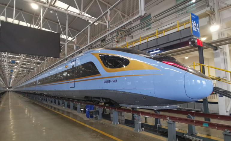 CR300BF型“复兴号”动车组,由中国中车长春轨道客车股份有限公司研发,中车长春轨道客车股份有限公司和中车唐山机车车辆有限公司生产制造,是中国标准动车组系列化产品之一。设计最高运营速度250km/h,列车总长208.95m,车体最大宽度3.36m,车辆最大高度4.05m,列车总重431.3t,车体材质为铝合金。涂装方面延续复兴号“金凤凰”设计理念,两条金色飘带贯穿全车,头部凤眼展现车辆灵机与生动,金色与“海空蓝”底色协调统一,深灰色车下设备裙板沉稳大气。因车身采用“海空蓝”颜色涂装,该车型也被称作“蓝暖男”。(总台央视记者 李志 孟寒江)
