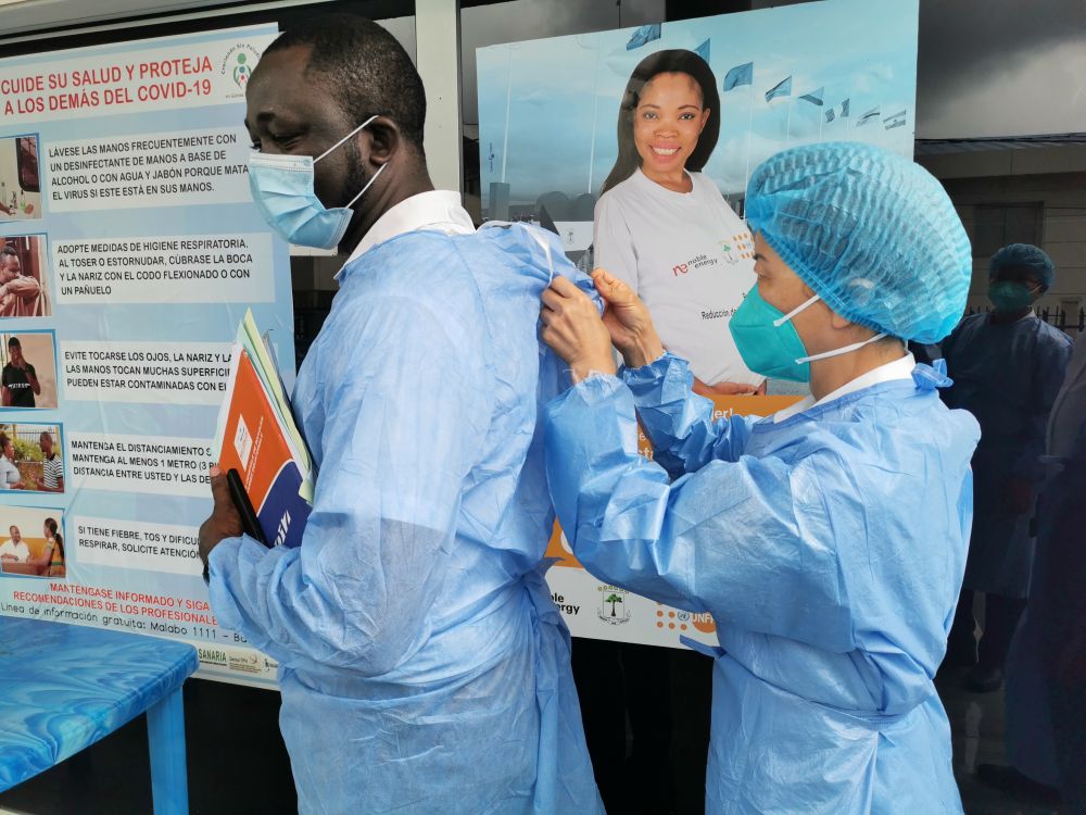 6月1日,在赤道几内亚首都马拉博一所收治新冠患者的定点医院,中国抗疫医疗专家组成员帮助当地同行整理防护服。(新华社发,专家组供图)