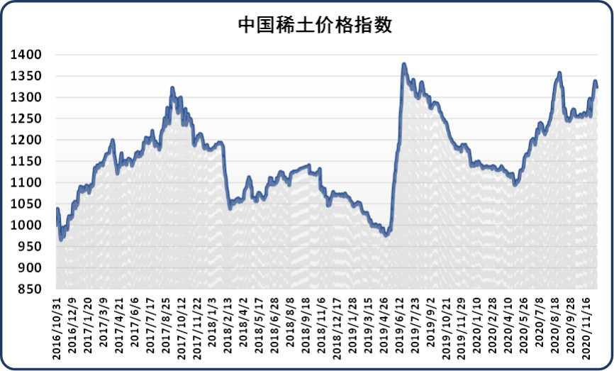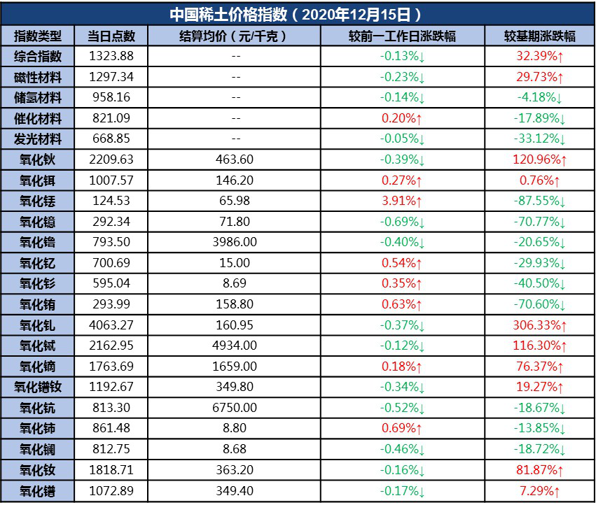 新华财经北京12月15日电(刘星麟)15日,中国稀土价格指数报1323.88点,较前一工作日下跌1.69点,跌幅为0.13%。氧化镨钕价格偏弱延续,上下游成交僵持,高价成交承压,市场观望氛围浓厚。