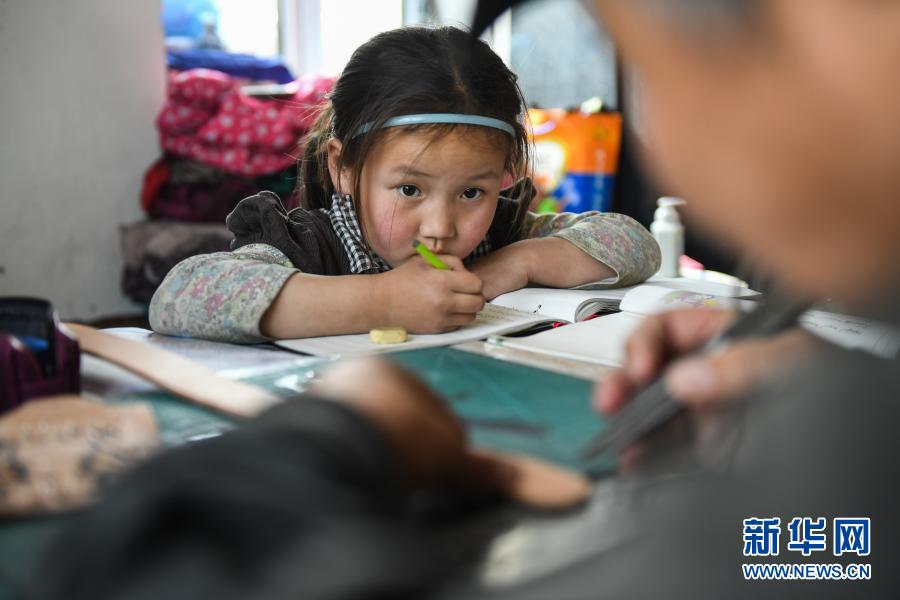 4月15日,在锡尼河镇的出租房内,女儿南吉乐玛写作业时看爸爸制作皮制品。