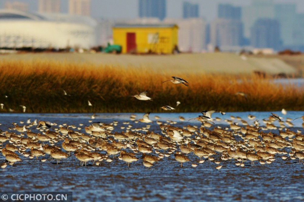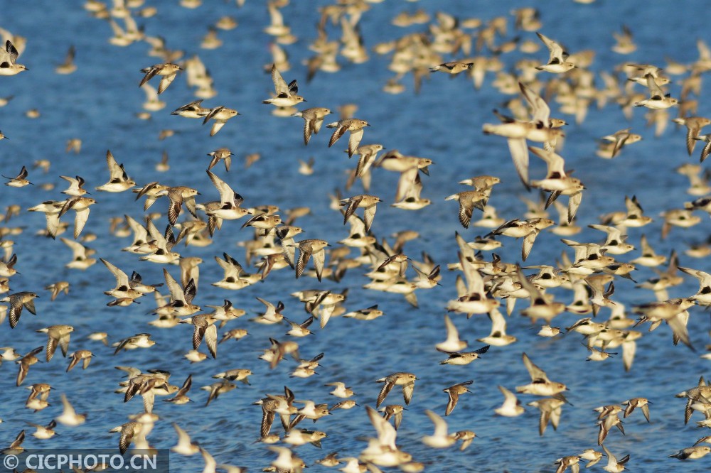 ↑2020年12月14日,山东省青岛市城阳区河套滨海湿地,成群鸻鹬类候鸟在海中巡游。CICPHOTO/王海滨 摄