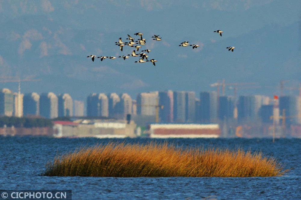 ↑2020年12月14日,山东省青岛市城阳区河套滨海湿地,一群翘鼻麻鸭在涨潮时分飞往滩涂觅食。CICPHOTO/王海滨 摄