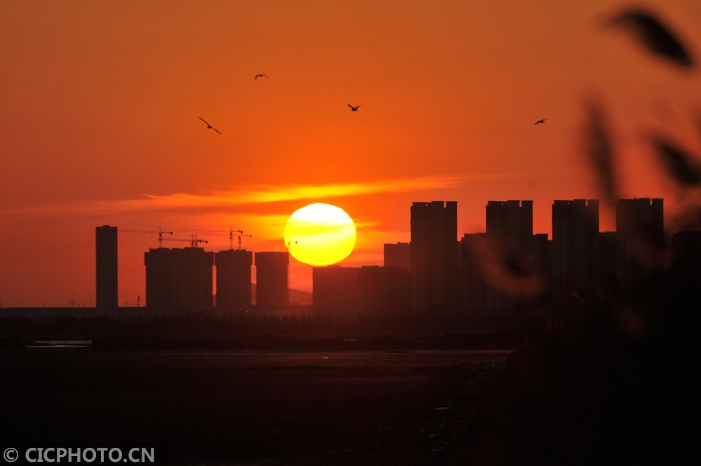 ↑2020年12月14日,这是在山东省青岛市城阳区河套滨海湿地拍摄的夕阳晚霞景色。CICPHOTO/王海滨 摄