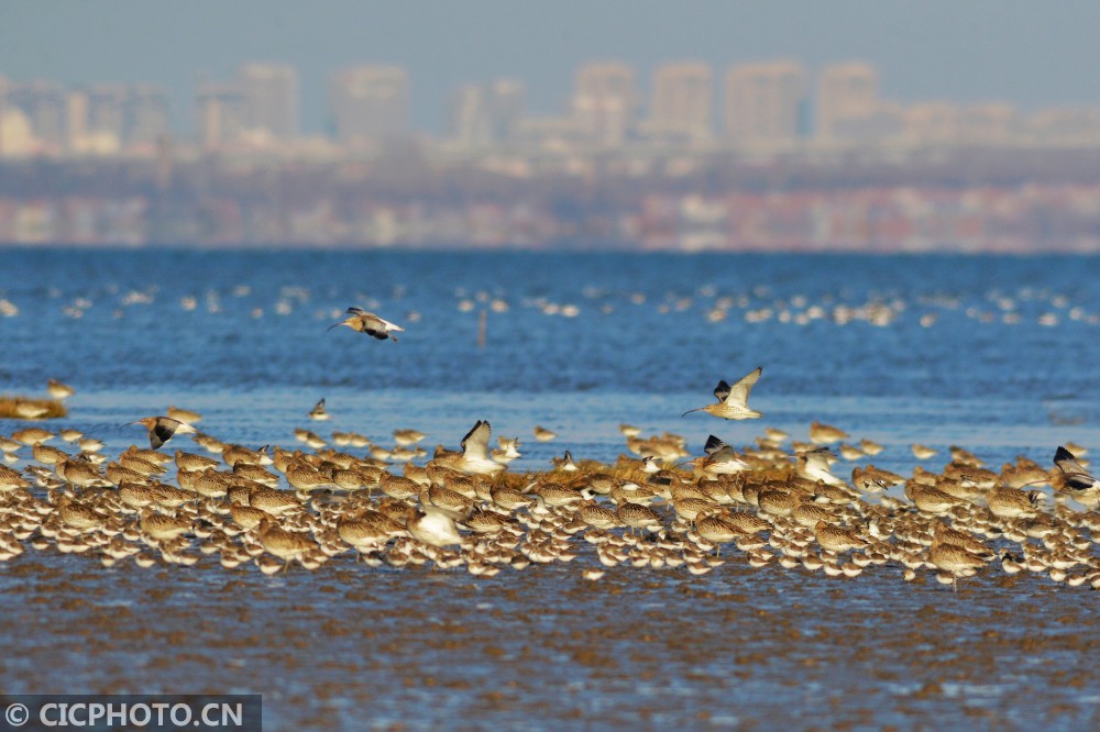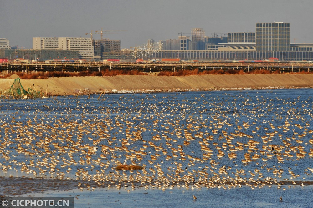 ↑2020年12月14日,山东省青岛市城阳区河套滨海湿地,鸻鹬类候鸟集中越冬滩涂觅食栖息。CICPHOTO/王海滨 摄