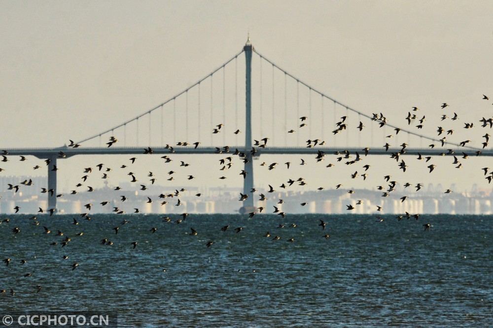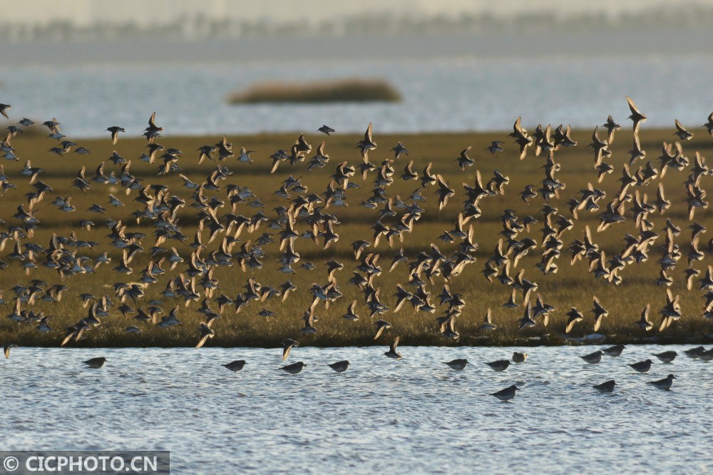 ↑2020年12月14日,山东省青岛市城阳区河套滨海湿地,成群宾鹬飞过浅滩觅食。CICPHOTO/王海滨 摄