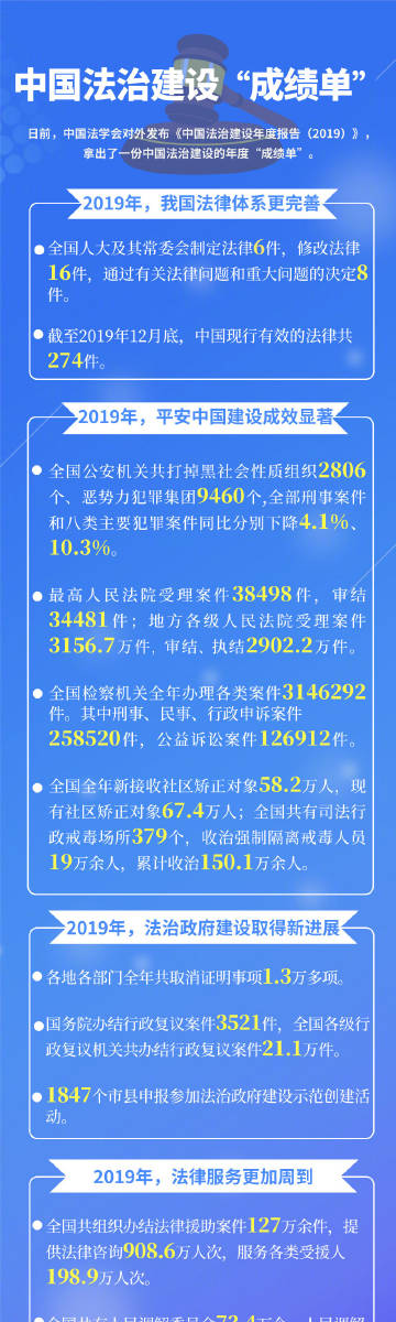 【您好,这里有一份#中国法治建设成绩单#请查收!】日前,中国法学会对外发布《中国法治建设年度报告(2019)》,拿出一份中国法治建设的年度“成绩单”。国家法治建设的“大成绩”,关系着每个公民的“小确幸”。这份“成绩单”各项单科成绩在此,戳大图↓↓